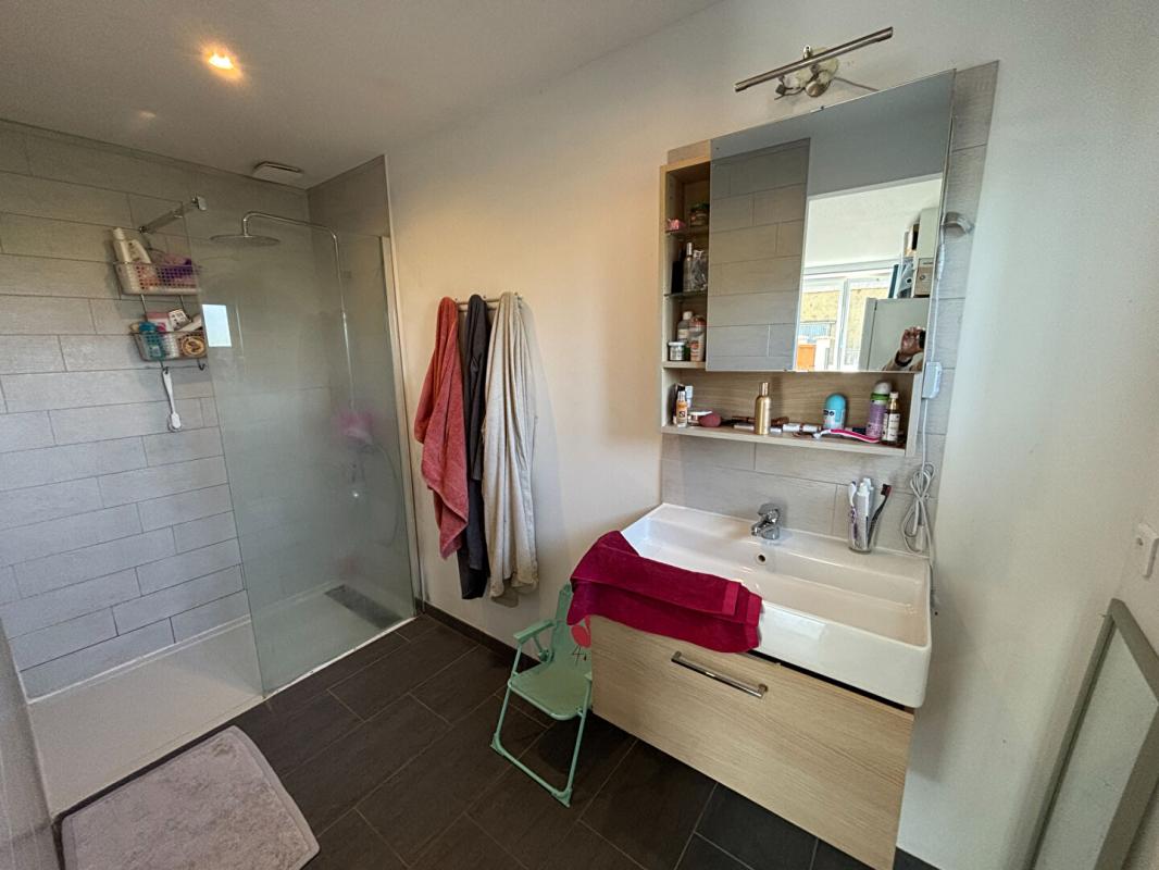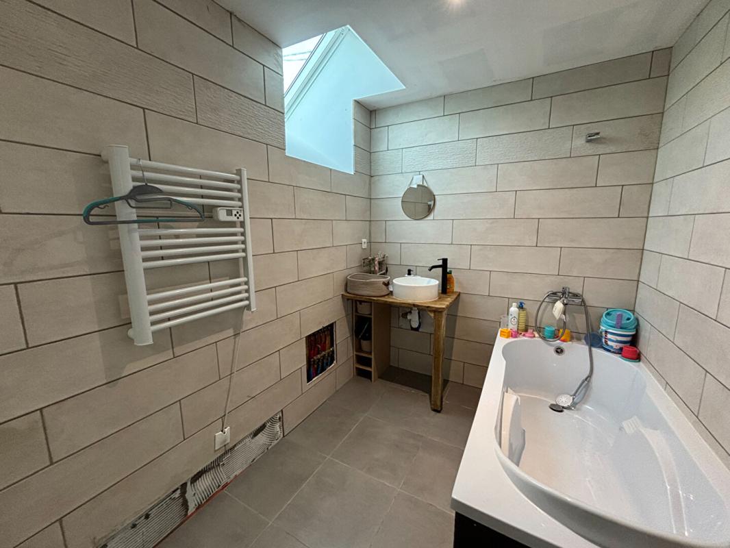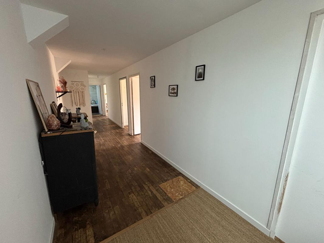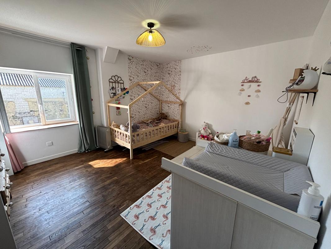 Au rez-de-chaussée, vous découvrirez une grande pièce de vie lumineuse avec cuisine ouverte aménagée et équipée, agrémentée d’une cheminée avec poêle à bois, ainsi qu’une chambre parentale avec salle d’eau privative, un WC indépendant et une buanderie.